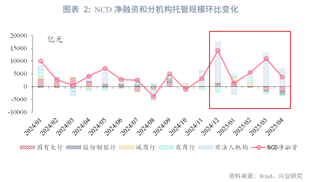 从NCD的投资机构来看,国有大行对于NCD已经从净买入到净减持,资管产品则成为NCD的主要投资机构和银行负债缺口的主要供给方。2024年初,国有大行、农商行仍是NCD的主要投资机构;2024年4月至5月,规范存款“手工补息”后,资管产品曾经短暂增持了NCD。2024年12月非银存款自律以来,非银活期存款的利率参考7天逆回购利率,资管产品将此前配置的同业存款大量转换为NCD。2024年12月、2025年3月和2025年4月,在银行缺负债的时点,资管产品已然成为NCD主要投资机构,显示银行和非银在中长期流动性上的供需地位扭转。