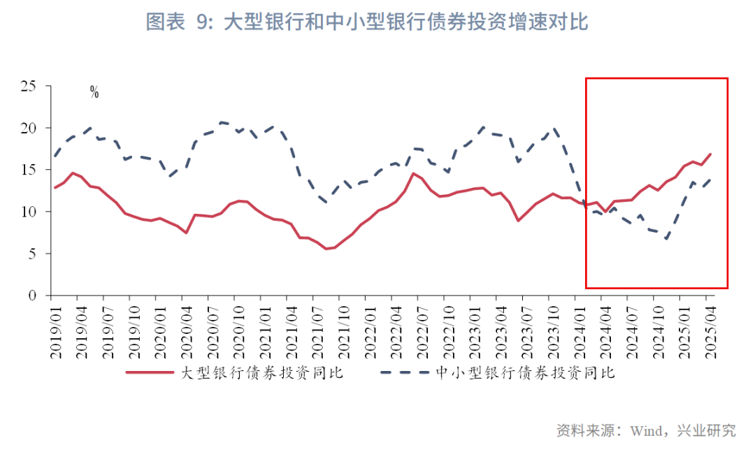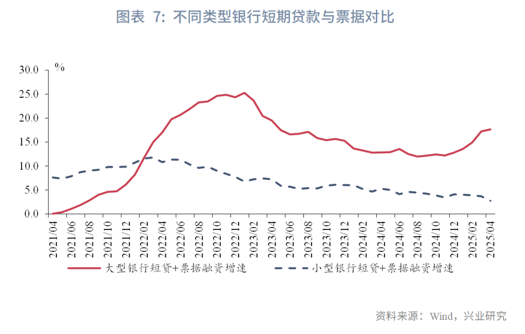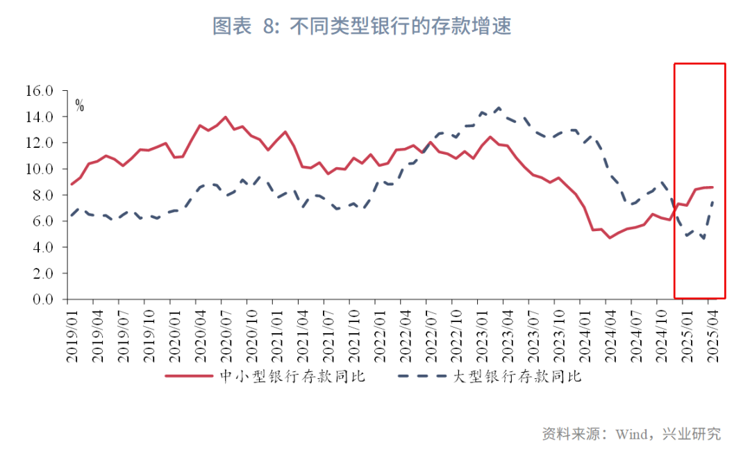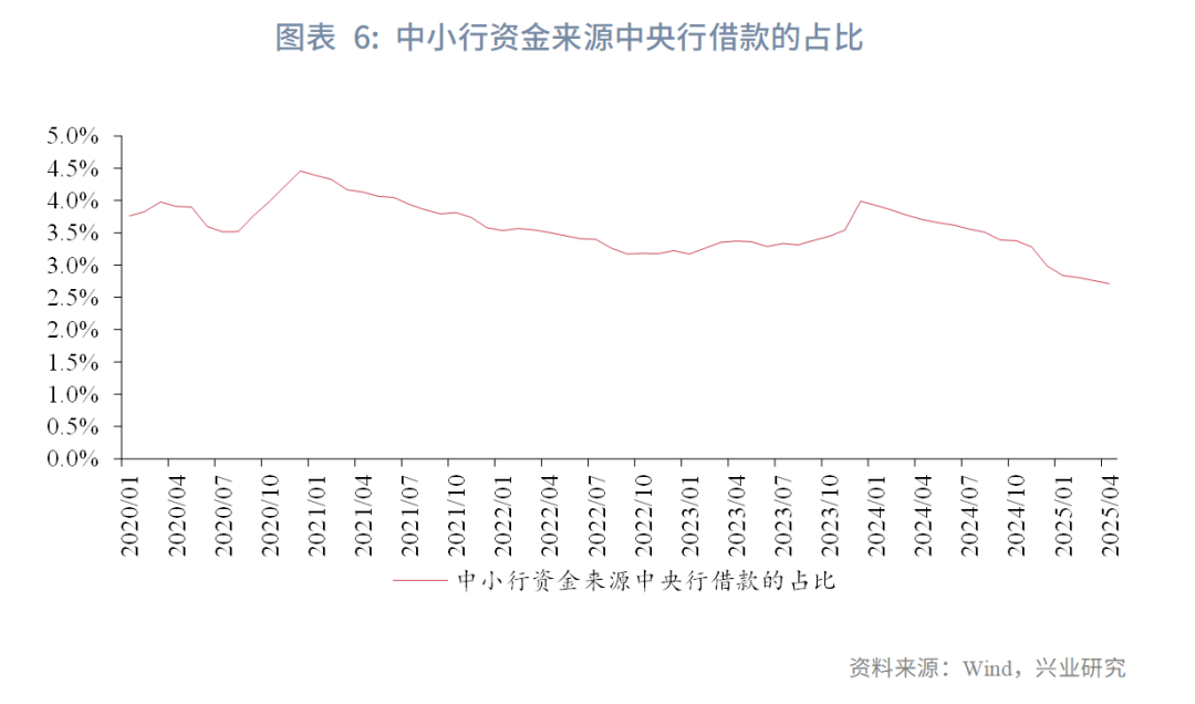 三是中小银行的负债缺口缩小,对央行流动性的依赖随之下降。随着一些存款从大行向中小行“搬家”,中小型银行的存款增速反向超过了贷款增速。中小行资金来源中央行借款的占比从2024年1月的3.9%下降到2025年4月的2.7%。
