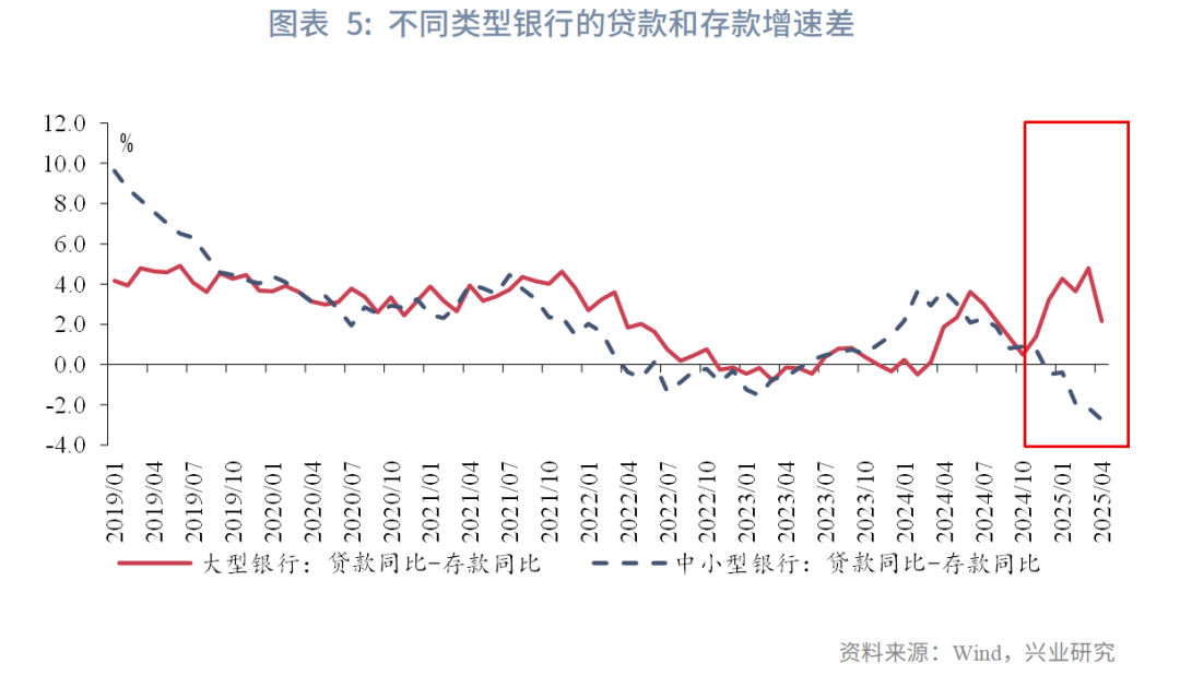 然而,存款市场格局的变化方向相反。自2024年以来,中小型银行的存款增速回升,并在2024年12月超过了大型银行,而大型银行存款增速可能受到规范存款“手工补息”和非银存款自律的影响更大;2025年以来,国有大行贷款增速-存款增速之差进一步上升,而中小型银行的存款增速反向超过了贷款增速。