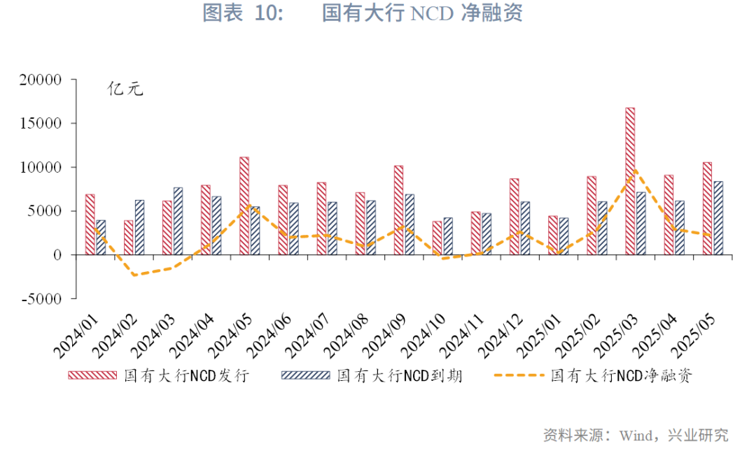国有大行面临更为严格的流动性指标、银行账簿利率风险指标监管,这要求资产和负债期限匹配。然而,在规范“手工补息”、规范非银存款定价和季末信贷投放集中的时点,都出现了阶段性的负债缺口,需要以NCD补足。我们在上年12月的报告中指出,大行可能提升NCD备案额度来平衡资产端久期。2025年,大行如期提升NCD备案额度3.5万亿元。人民银行在《2025年第一季度货币政策执行报告》中指出,“国有大型银行……在发展债券交易业务、引导债券市场合理定价、平抑市场波动方面可以发挥更多作用”。随着财政的逆周期扩张,国有大行将更加深度参与政府债券市场,对长期负债也将持续存在需求。