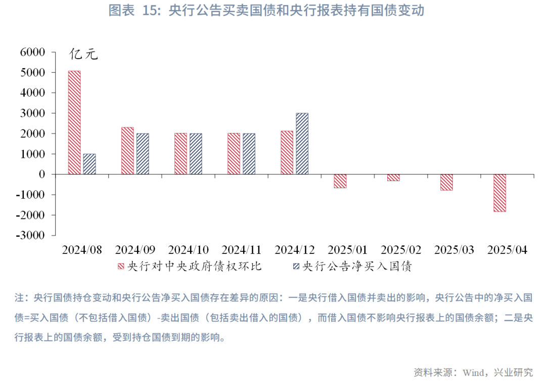 5月初央行宣布全面降准降息,但NCD利率短暂下行后再度提价。5月7日,央行宣布全面降准降息,降准50bp,7天逆回购、1年LPR和5年LPR均下调10bp,再贷款利率下调25bp;5月20日,国有大行下调存款挂牌利率,定存利率下调幅度大于贷款利率。5月DR007中枢为1.59%,较4月下行13bp。5月OMO降息后1年股份行NCD利率一度从1.75%下行至1.64%,存款利率下调后NCD转为提价,月末收于1.70%。5月降准释放流动性1万亿元,公开市场操作延续“MLF净投放+买断式逆回购净回笼”的格局,MLF净投放3750亿元,买断式逆回购净回笼2000亿元。5月政府债净融资规模1.5万亿元,其中,国债净融资0.9万亿元,地方债净融资0.6万亿元。2025年1-4月,央行持有的国债余额累计下降3600亿元,可能是上年买入国债部分到期。