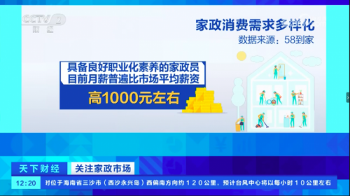 7月21日,央视财经频道《天下财经》栏目关注到家政市场供需两旺,通过走访家政消费者、劳动者、58到家培训中心调研发现, 暑期家政用工需求旺盛,平台方在积极促进家政服务职业化建设、拓宽劳动者就业渠道等方面的创新举措,58到家数据显示,三四线城市家政需求激增超200%,下沉市场正成为带动家政消费增长的重要引擎,具备良好职业化素养的家政员,月薪普遍比市场平均薪资高出1000元左右。